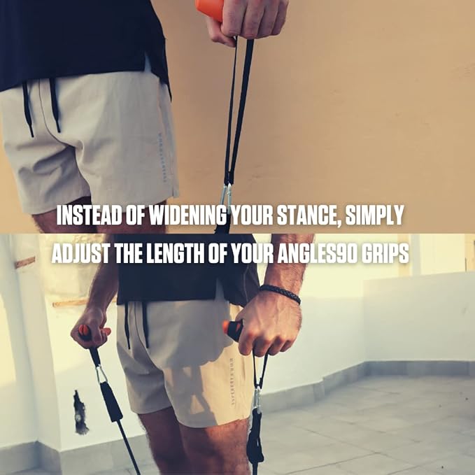 • Adjustable Resistance: Easily modify the resistance level by adjusting the strap of your Angles90 grips, ensuring efficient workouts without altering your stance. The length-adjustable feature supports various strength training needs