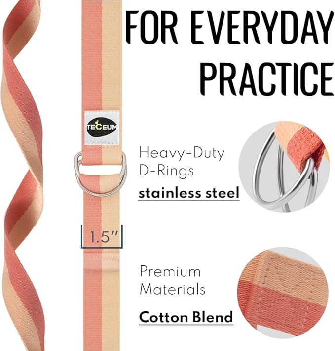 • STRONG & COMFY: Our yoga belts are made from high-quality cotton blend with eco-friendly yarn dyeing. It is non-elastic, durable and easy-to-clean material. The thick tight weave yet delicate soft-to-skin texture of the belt ensures both durability when carrying the mat and comfort during and comfort during practice. The D-ring loops are made from sturdy corrosion-resistant stainless steel and holds the yoga strap.