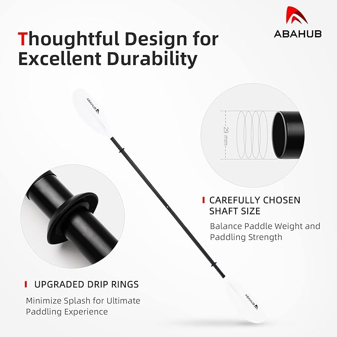 • MADE to LAST: Made of premium quality 1.15mm thick, 29mm diameter aluminum alloy shaft, and fiberglass reinforced polypropylene blades, total weighs 38oz (1075g). This kayak paddle is impact and erosion resistent, thus for great durability. It’s perfect for beginner and intermediate kayakers.