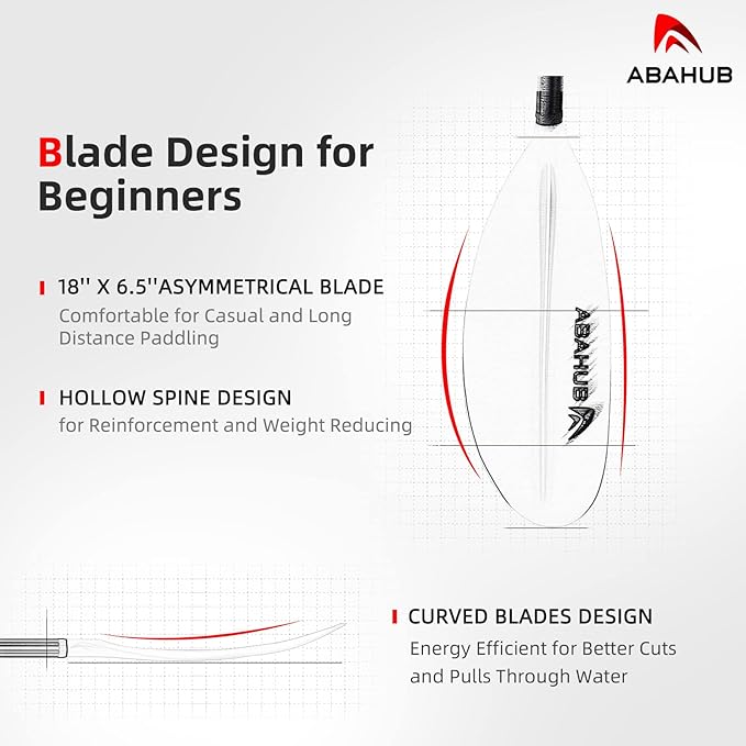 • ENERGY EFFICIENT BLADE DESIGN: With 18'' x 6.5''Asymmetrical blades, this paddle is comfortable and energy saving, both for casual and long distance paddling. The blades are feathered with a hollow spine for reinforcement and less weight. All these add up to better cuts and pulls through water.