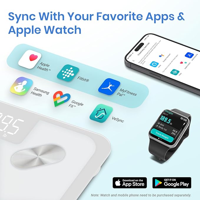 • Use with Ease: Seamlessly integrate our scale into your fitness routine. Compatible with APPLE WATCH and syncs data with popular fitness apps like Apple Health, Samsung Health, Google Fit, FitBit, and MyFitnessPal. Supports unlimited users for convenience