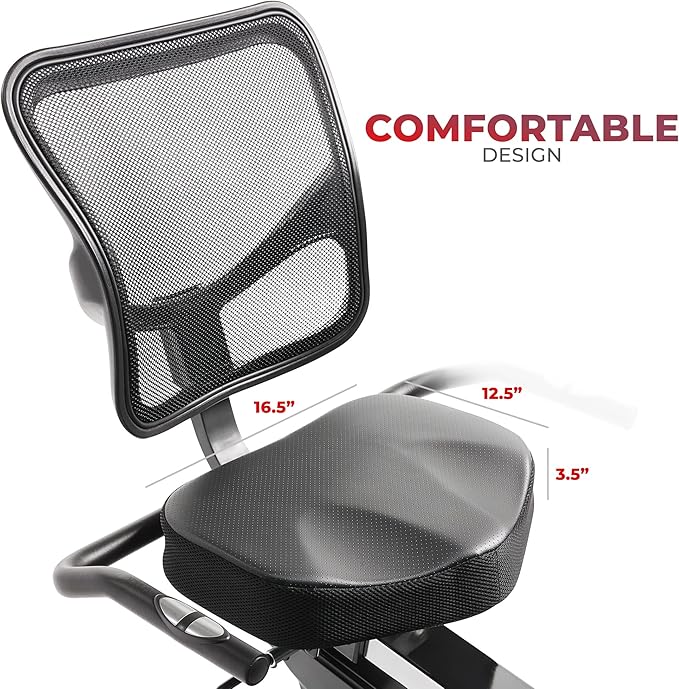 • 【 ADJUSTABLE ERGONOMIC SEAT WITH BREATHABLE MESH BACK 】 Enjoy optimal comfort with an easily adjustable, extra-padded seat and breathable mesh back, perfect for extended sessions on this recumbent bike.