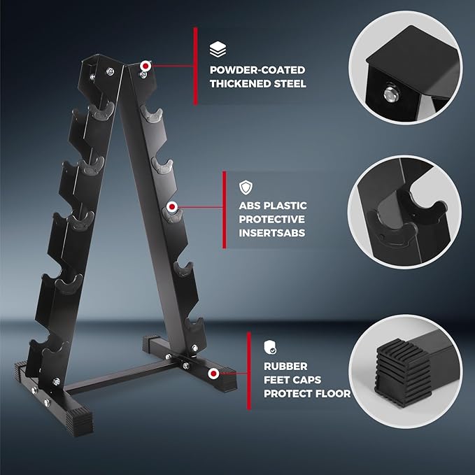 • Compact and Space-saving Rack: This weight rack features a heavy-duty construction with incredibly compact three-tiered design, allowing you to place it anywhere for your easy accessibility. Three angled horizontal shelves offer efficient barbell loading and retrieval. The solidly welded triangular base, with four non-skid feet, reinforces its overall structural stability. In addition to dumbbell storage, this rack can store kettlebells, medicine balls, yoga blocks, etc.