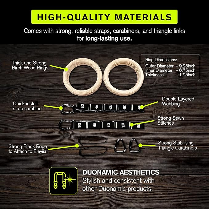 • SUPER EASY SET UP: Takes less than 1 minute to set up the Duonamic Rings with the Duonamic Eleviia Portable Pull Up Bar.