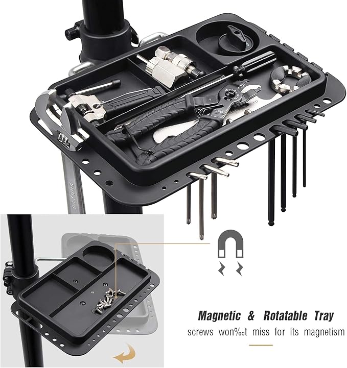 • 360 DEGREE ROTATABLE CLAMP & HEIGHT ADJUSTABLE BODY- Clamp with lever can hold your bike super steady, adjustable height make sure your waist comfortable during work
