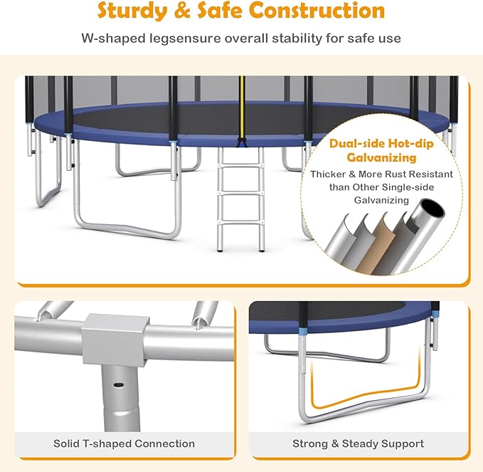 • Sturdy & Durable Construction: The trampoline for children and adults is crafted with galvanized steel frame, which is characterized by great rust resistance and durability. Foam covered on the frame can effectively prevent corrosion to ensure long-term outdoor use. Moreover, the legs strongly support the trampoline to make you jump in a more stable condition.