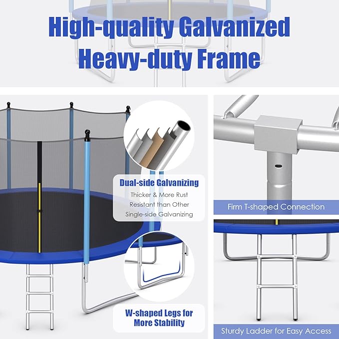 • Easy Installation & Convenient Use: With the installation manual included in the package, you can assemble the trampoline effortlessly. We provide you with six different options (8/ 10/ 12/ 14/ 15/ 16 FT with 42/ 54/ 72/ 80/ 90/ 108 PCS high-extension and rust resistant springs) for choice to satisfy various requirements. Besides, the ladder is equipped with a 2-step ladder for easy access to inner space.