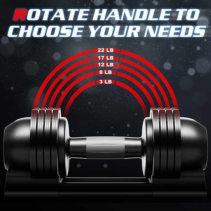 • Adjustable Weight - Come with 2pcs dumbbell set. Each adjustable weight dumbbell features free weight adjustment from 3- 8-12-17-22lb, the total weight of dumbbell set is 44lb. Suitable for beginners to professional. Committed to meet your needs for diversified weight training, it is a great choice for modify muscle lines and strong muscle fibers