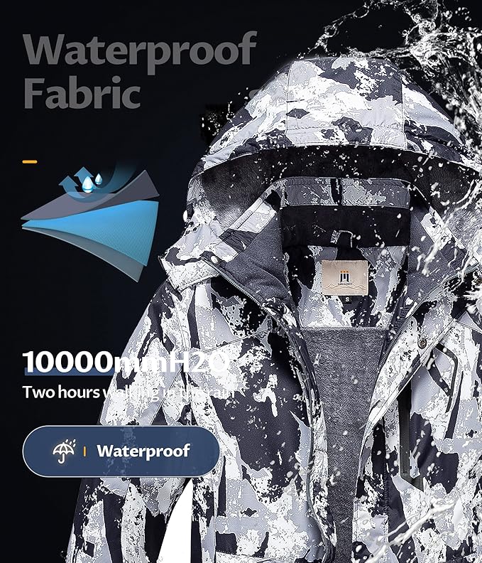 • ❄ Waterproof & Breathable--Men's rain jacket is standard 2-layer shell provides 10000mm/10000g waterproof/breathable protection from the elements.Durable water repellent (DWR) finish sloughs off moisture and wet snow and keep the inside dry, reducing washing times and prolonging service life.