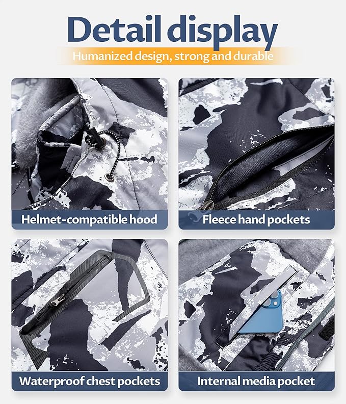 • ❄ Functional Pockets--Snowboarding jacket with waterproof chest zipper pocket(ski pass pocket), 2 zippered micro fleece handwarmer pockets. Internal media pocket with media port. Internal large pocket can put ski goggles, water glasses.