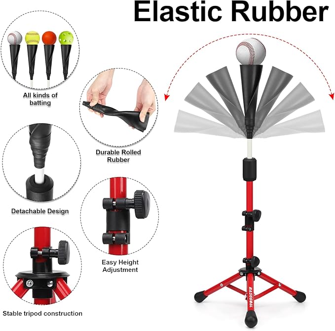 • 2.【Adjustable Height】kids baseball tee can adjustable Height adjustment from 22.2" to 35". Easy twist and lock height.