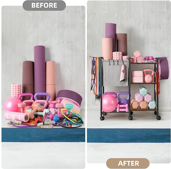 • 【EXTRA LARGE CAPACITY HOME GYM STORAGE RACK】 Our exercise equipment storage rack consists of 4-tier of storage racks and a storage basket, which can store your various fitness equipment, such as workout mat, yoga mat thick, yoga block, foam roller, dumbbells, kettlebells, resistance bands and so on, perfect for fan of yoga and fitness enthusiast.
