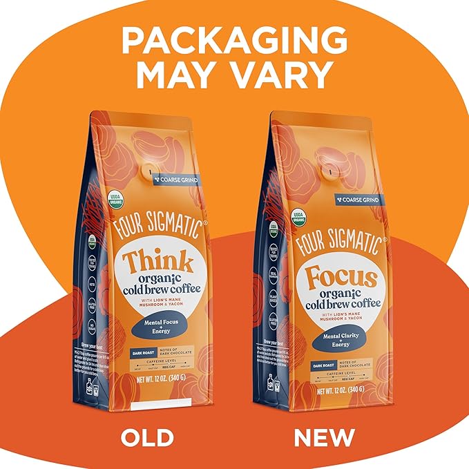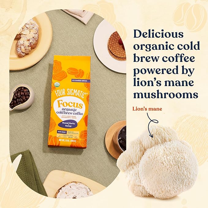 Four Sigmatic Organic Cold Brew Coffee Grounds | Dark Roast, Coarse Grounds with Lion's Mane and Chaga | Cold Brew Mushroom Coffee for Crash-Free Focus | 12 oz Bag