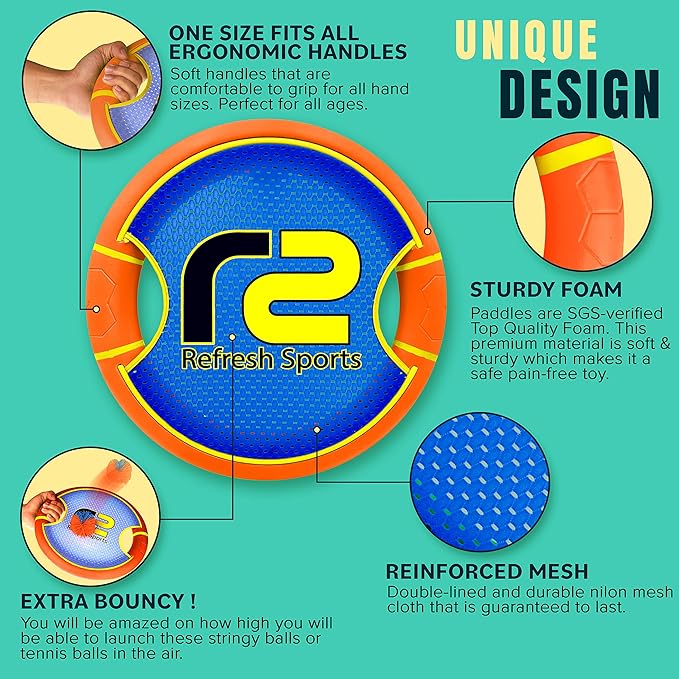 • 𝗠𝗨𝗟𝗧𝗜𝗣𝗟𝗘 𝗚𝗔𝗠𝗘𝗦, 𝗢𝗡𝗘 𝗦𝗘𝗧: Easy to pick up and play Badminton, Tennis, Baseball, and so much more! With the stringy balls and paddle's bouncy mesh, you can easily transition between games that would normally require separate equipment. You can even swap the rubber balls for water balloons on hot summer days for some extra splashy fun!