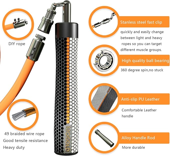 • Special Feature : Ergonomic, Fast interchangeable jump ropes from light to weight, Kink Resistant, Slip Resistant, Weighted-1/5lb 1/4lb 1/2lb Ergonomic, Fast interchangeable jump ropes from light to weight, Kink Resistant, Slip Resistant, Weighted-1/5lb 1/4lb 1/2lb
