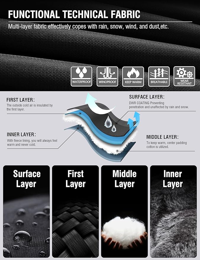 • Waterproof & Quick Dry Winter Coats for Men: Our winter jacket with a professional water repellent coating and has a waterproof level of 10000mm. The zippers are also waterproof, so you don't have to worry about getting wet while skiing, snowboarding, or in rainy weather.