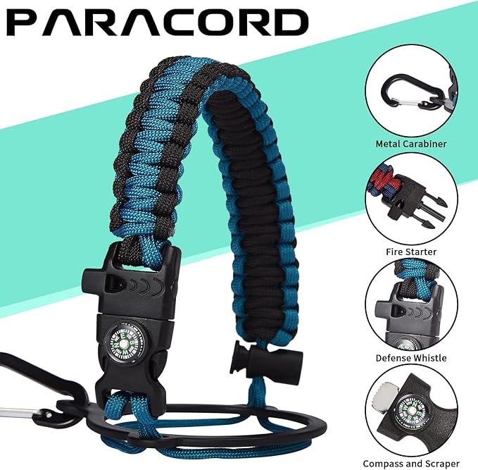 • UNIQUE DESIGNS PARACORD HANDLE: Full-function paracord handle made in individual styles to match the color of the flask water bottles. With compass, safety ring, carabiner, flint fire starter & whistle. It unravels into a sturdy and taut rope in an emergency, making the large water jug an ideal survival kit for expeditions in the wild