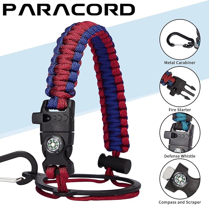 • UNIQUE DESIGNS PARACORD HANDLE: Full-function paracord handle made in individual styles to match the color of the flask water bottles. With compass, safety ring, carabiner, flint fire starter & whistle. It unravels into a sturdy and taut rope in an emergency, making the large water jug an ideal survival kit for expeditions in the wild