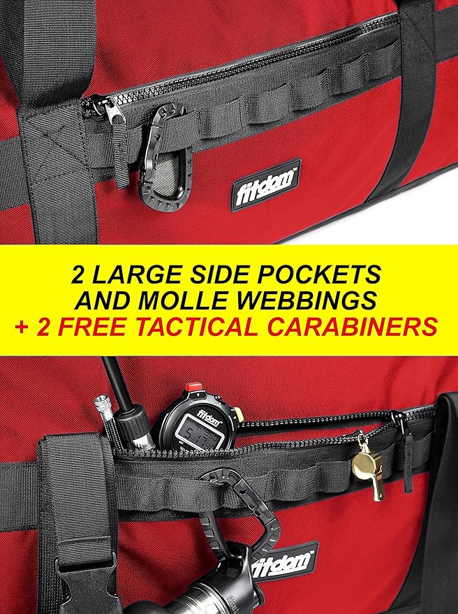 • FIELD TESTED AND FOR ATHLETES ON THE GO – We are passionate with our product and designed our dufflebag with real life encounters. Molle webbings were added for attaching keys, water bottles and other accessories on the go. 4 ventilating holes reduce bad smell when carrying wet cloth or other items. 2 extra tactical carabiners are included for your convenience. We are proud to say our long duffell is not just a bag but a companion for your outdoor activities.