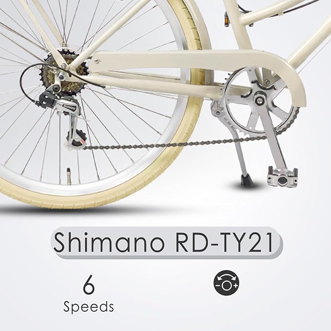 • 🚴‍♀️【Women-Centric Ergonomic Design】Crafted for female proportions: A low-step high-carbon steel frame enables easy mounting, while the swept-back handlebars promote upright posture (reducing back strain). The brown synthetic leather saddle with shock-absorbing springs combines vintage aesthetics with modern comfort.