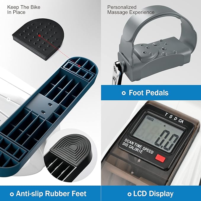 • ▲Functional LCD Monitor Displays:▼ Portable foot cycle arm & leg peddler machine with LCD screen displays includes exercise time, revolution count, revolutions per minute(RPM), calories burned and resetting button and easily to arrange your exercise information data. Moreover includes a scan feature that can show all measurements in sequence, make you know your exercising journey more easily.