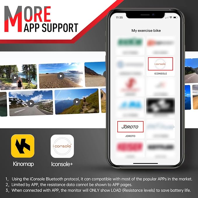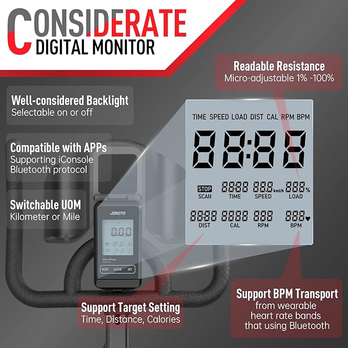 • 【Own-developed Bluetooth Digital Monitor】- This stationary bike’s monitor is Bluetooth & Backlight, shows time, distance, speed, RPM, load (Readable Resistance Levels: 1% to 100%), calories, and BPM (If connected with wearable heart rate bands). You can have total control over the pace and duration of your riding. The Bluetooth connectivity to 3rd-party apps allows you to follow structured workouts or ride a route. So your fitness or weight loss journey can be specific in meeting your needs.