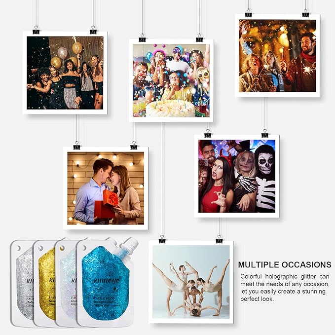• 【MULTIPLE USES】The holographic chunky glitter gel can be used for dates, holiday parties, stage shows, bars and more. It can perfectly decorate your face, collarbones, eye shadow, lips, nail art and more. Our body glitter can make you shine as the center of attention in the crowd under the lights of a party or nightclub.