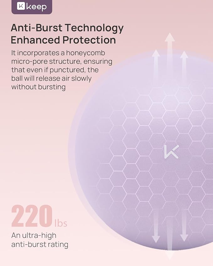 • Anti-Bust & Worry-Free -- The KEEP Fitness Ball features anti-burst technology with a honeycomb microporous foaming structure. It has passed strict explosion-proof test, with an ultra-high anti-burst rating of 1300 lbs. In the event of puncture by sharp objects, the ball deflates slowly rather than bursting, ensuring your safety is always protected