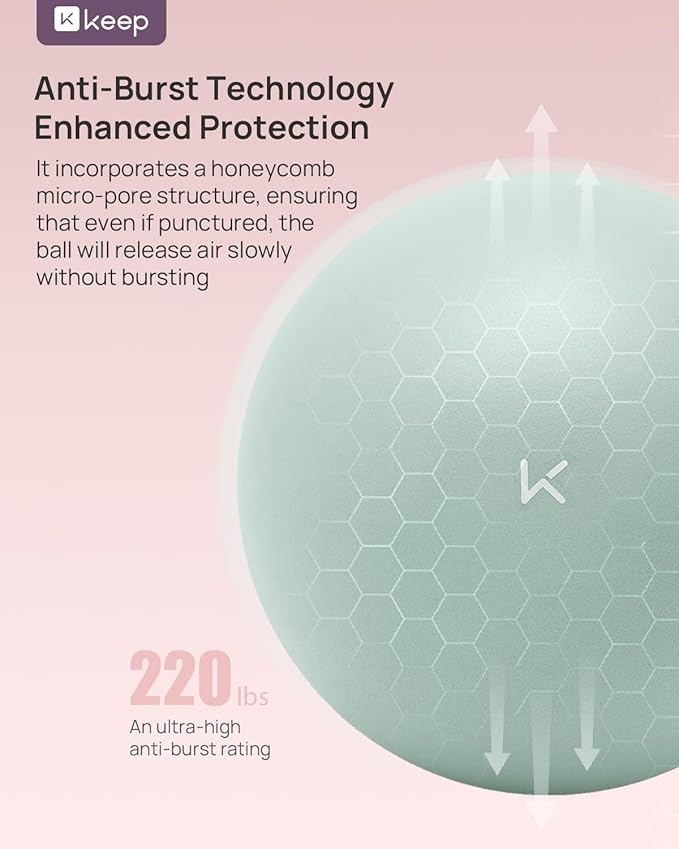• Anti-Bust & Worry-Free -- The KEEP Fitness Ball features anti-burst technology with a honeycomb microporous foaming structure. It has passed strict explosion-proof test, with an ultra-high anti-burst rating of 1300 lbs. In the event of puncture by sharp objects, the ball deflates slowly rather than bursting, ensuring your safety is always protected