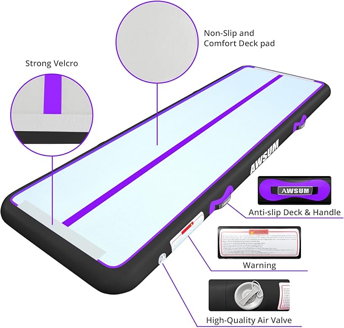 • Professional Tumbling Mat: AWSUM Air mats is made of high-quality PVC tarpaulin. All seams are made by handwork. Gymnastic mat Outer layer of mat is made of double-layer waterproof tarpaulin, better water-resistance. Tumble mat Inside is made of V-drop stitch technology, better flexibility
