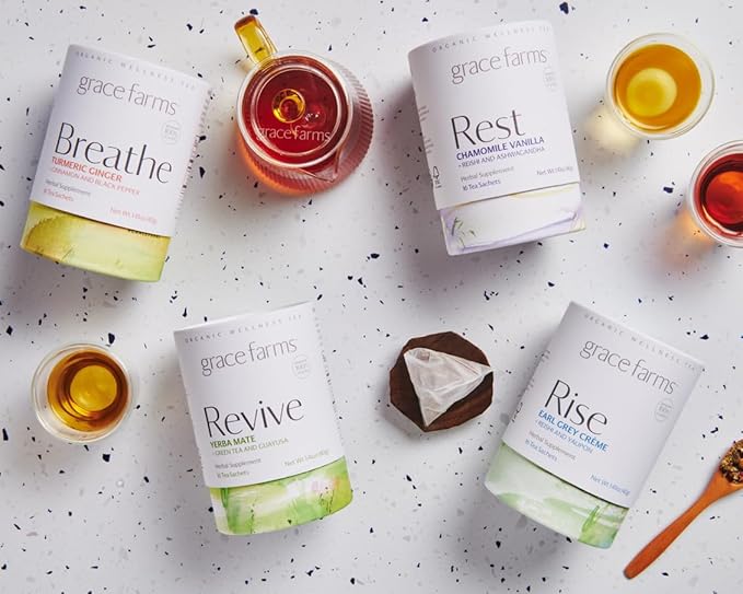 Grace Farms REVIVE Wellness Organic Tea Blend (16 Pyramid Sachets) | Yerba Mate, Green Tea, & Adaptogens | Natural Energy Coffee Replacement | Fairtrade & Kosher | Gives Back 100% of Profits