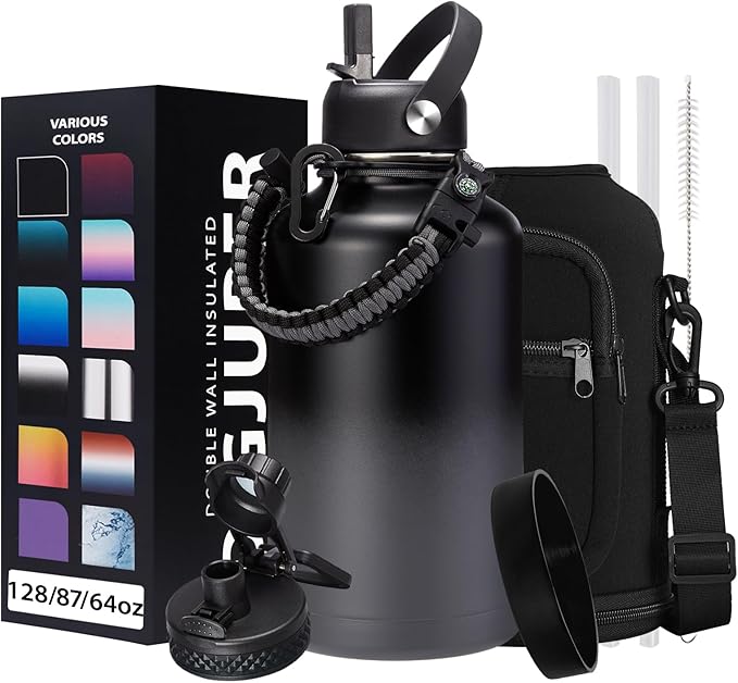 • SUPER JOYFUL COMBO: Buy a 64 oz insulated water bottle, get 9 accessories (2 x lids, 1 x survival paracord, 1 x carrying pouch, 1 x shoulder strap, 1 x protective cup mat, 2 x straws, 1 x straw brush). DIGJUPER provide a lifetime warranty and 7X24H customer service.