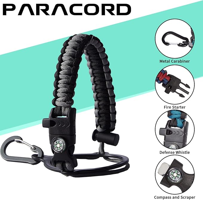 • UNIQUE DESIGNS PARACORD HANDLE: Full-function paracord handle made in individual styles to match the color of the flask water bottles. With compass, safety ring, carabiner, flint fire starter & whistle. It unravels into a sturdy and taut rope in an emergency, making the large water jug an ideal survival kit for expeditions in the wild
