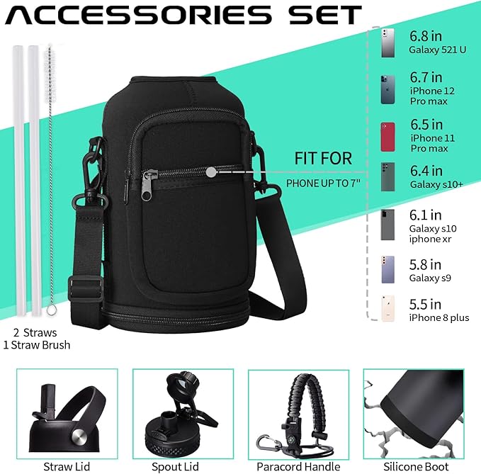 • PROTECTIVE BOOTS & STORAGE SLEEVE: Upgraded silicone boots prevent shattering and cracking when stainless steel water bottle accidental dropped. And storage carrying pouch with removable shoulder strap for convenient hands free carrying! The safe zippered pocket design to stores all your stuff, holds your cards & phone & key
