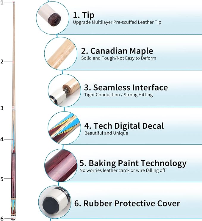 • ?…【HIGH PERFORMANCE POO CUE??These Pool cue sticks are made of canadian Maple Wood,which is firm and durable, we have chosen the best quality for the pool stick and the pool cue tips durability. You will receive pool cues set of 4.