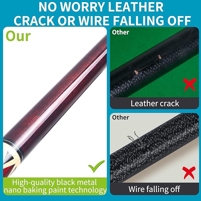• ?…【ATTRACTIVE BAKING PAINT DESIGN??AKLOT Pool stick adopt optimized lightning maple and high-quality black metal nano baking paint technology.You do not worry about the leather crack or thred falling off.