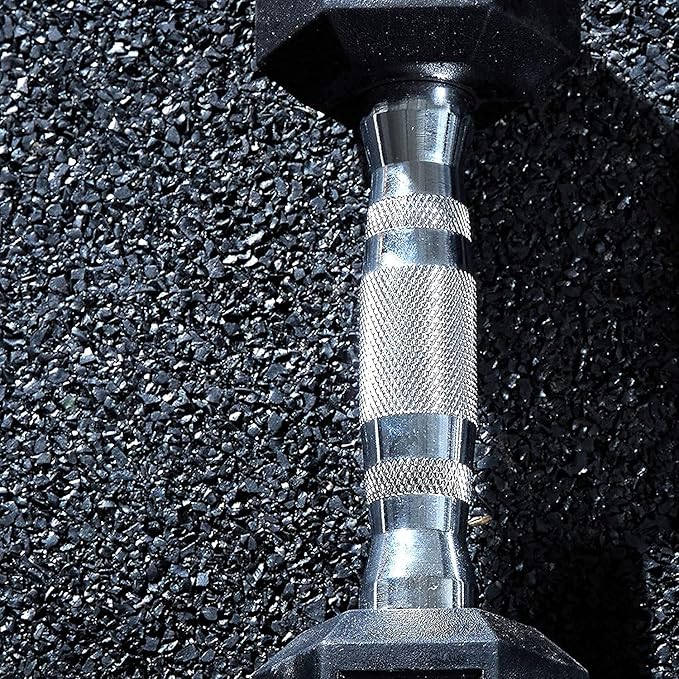 • ?‘Š Rubber Hexagon Shaped with Rubber Grip Handle - Rubber hexagon shaped head prevent rolling, protect your floor and keep the dumbbells stay in place; the rubber grip with depth knurling contoured handle provides essential grip and security during use.