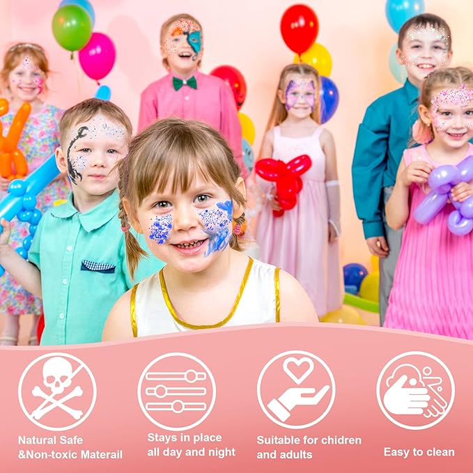 • 【Easy-on,easy-off】Has a stick adhesive,goes on smoothly with a quick swipe of a finger or brush after easy squeezing out.Can be applied over face paint designs or body shimmer without smearing them.For ultimate glitter effect apply in layers letting each layer dry before applying the next.Easily remove with soap and water.