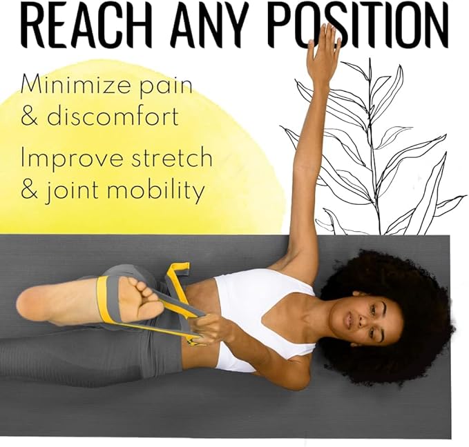 • 2-IN-1 YOGA BELT. Color: YELLOW GRAY. Length: 10 FT. Width: 1.5 IN. Material: Cotton Blend. Non-elastic. Superior Non-slip Grip.