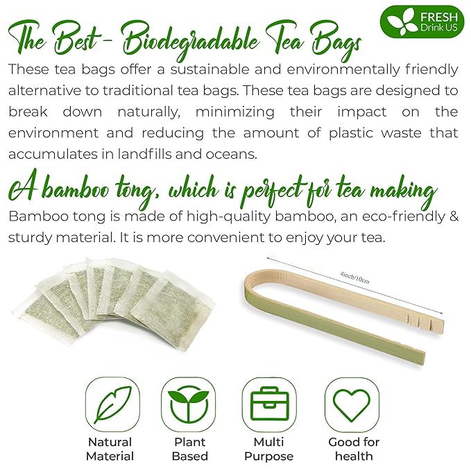 • ☘️ BIODEGRADABLE TEA BAG - NATURAL MATERIAL: The tea bags are made of natural corn fiber, which is friendly for the environment. No Strings. No Wrapped. No Staples. No Adhesive. No Bleach. No Dyes - 100% Safety.