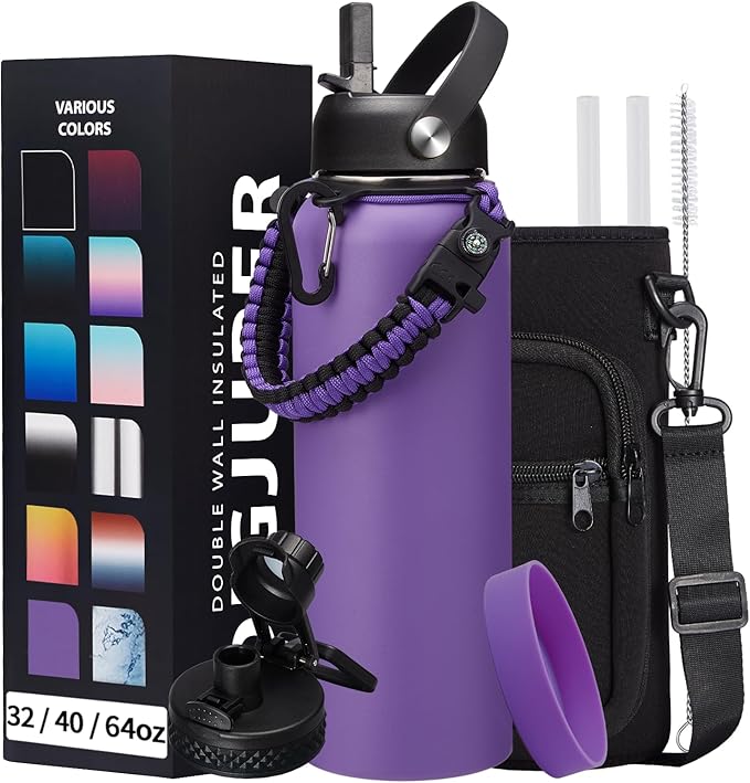 • COMBO—Super Deal: Buy 40oz stainless steel water bottles and get 9 accessories (2 x lids, 1 x survival paracord, 1 x carrying pouch, 1 x shoulder strap, 1 x protective cup mat, 2 x straws, 1 x straw brush). WITH A LIFETIME GUARANTEE, these thermal water bottles are the perfect gift for use at home, work, school, road trips, hiking, sporting events, or just hanging out