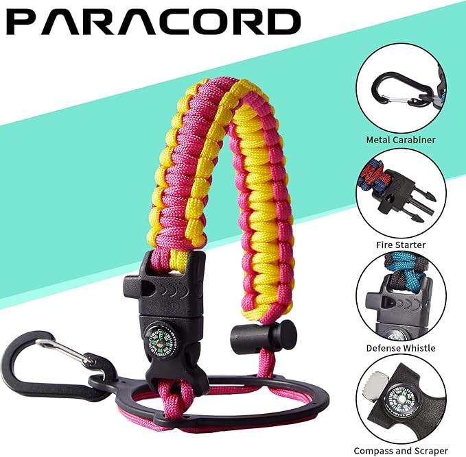 • UNIQUE PARACORD HANDLE: Bright color paracord matches the flask water bottle to give you a youthful vibe while adding a personal style. With a compass, safety loop, metal carabiner, flint, igniter and whistle to become your survival tool, making the 32 oz stainless steel water bottle with paracord an ideal survival kit for expeditions in the wild