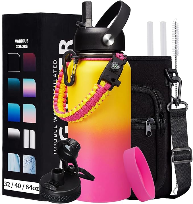 • SUPER JOYFUL COMBO: Buy 32oz insulated water bottles and get 9 accessories (2 x lids, 1 x survival paracord, 1 x carrying pouch, 1 x shoulder strap, 1 x protective cup mat, 2 x straws, 1 x straw brush). WITH A LIFETIME GUARANTEE, these thermal water bottles are perfect gifts for using at home, work, school, road trips, hiking, sporting events, or just hanging out