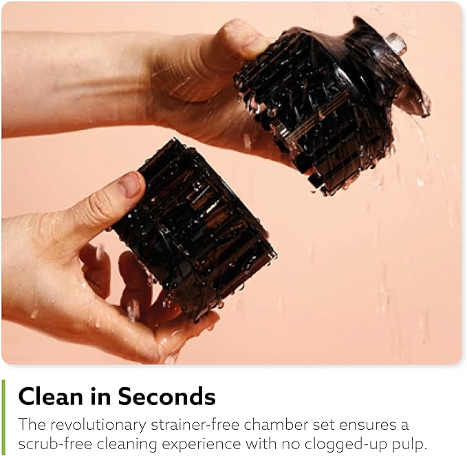 • STRAINER-FREE - Traditional juicers require a strainer which collects minerals over time, requiring extensive scrubbing. The H400 utilizes a revolutionary mechanism that minimizes pulp - even without a strainer. The strainer-like function is practically embedded within the chamber and the two-part auger meshes together to strain out pulp-free juice – which means bare minimum cleaning for high-quality juice!