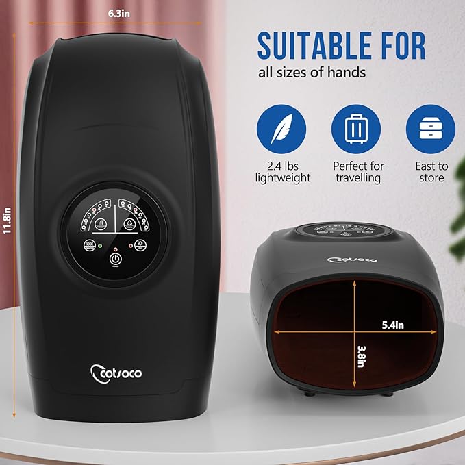 • EFFECTIVE MASSAGE: Five precise pressure points are designed inside the Cotsoco Electric Hand Massager. By pressing the upper and lower airbags on your hand, it can effectively stimulate the acupoints on your hand, relieve your hand fatigue, and relieve muscle soreness. Ideal for arthritis, carpal tunnel and pain relief.