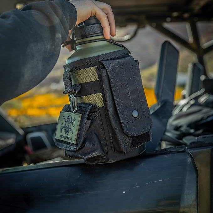 • REMOVABLE COVER - Made from military grade rip and tear resistant fabrics. The nylon cover is removable, washable, and has two utility pouches for your cellphone, wallet, keys, and other belongings, and a removable paracord carry handle. Covers can be interchanged between all Iron Infidel 2 liter bottles.