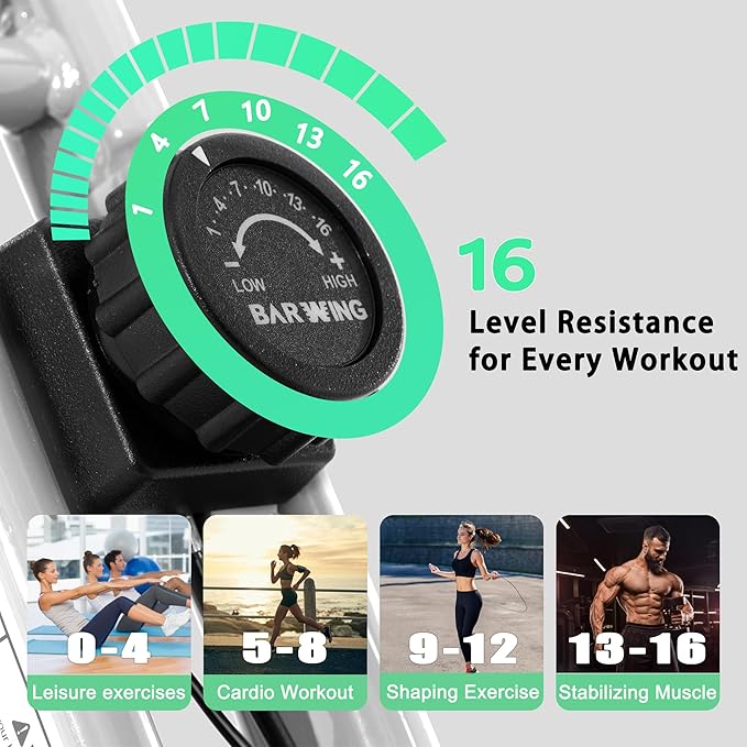 • 【16-LEVEL MAGNETIC RESISTANCE】Designed for quiet home workouts, the indoor cycling bike features a precision-balanced 6.6 lb flywheel with advanced friction-reduction technology. The commercial-grade woven resistance band works seamlessly with the 4-magnet system to provide smooth, near-silent operation-perfect for apartments and shared living spaces. Experience consistent 22 N·m magnetic resistance with minimal maintenance required.