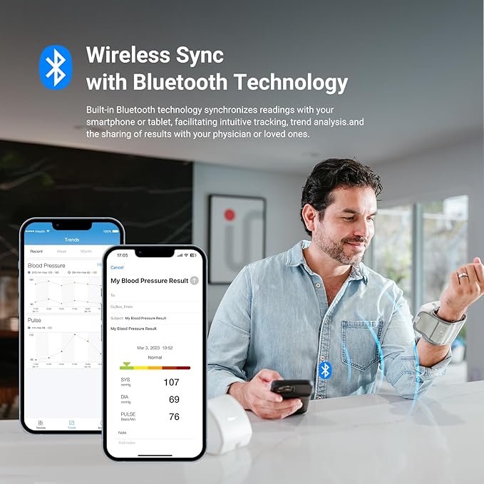 • Effortless Data Syncing: Built-in Bluetooth syncs readings to our free app for easy tracking, storing, and sharing with doctors. Monitor stores 99 readings, app stores unlimited data.