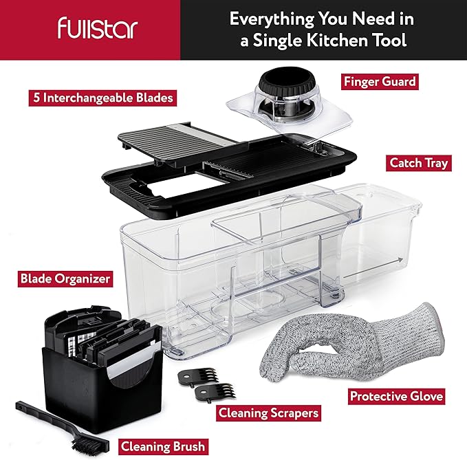 • Extra Handheld Spiralizer - Compact and easy to use, the Fullstar mandoline slicer comes with a 3 in 1 adjustable spiralizer. Unlike large units, this kitchen gadget is easy to store and a breeze to clean as it is dishwasher-safe.