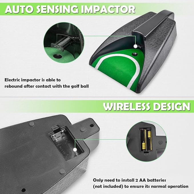 • 【Battery Control】The golf putting machine runs on batteries, which means you don't need to worry about cords or outlets. By simply inserting two AA batteries, you can practice your putting indoors or outdoors.(Not included battery)